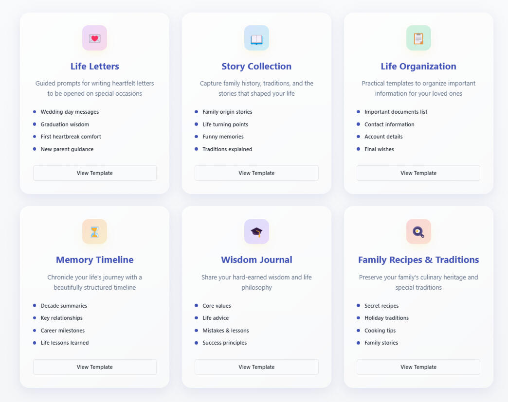 Get immediate access to our complete template collection. Everything you need to start preserving your wisdom today.